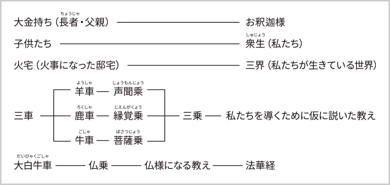 1 三車火宅(さんしゃかたく)の喩(たと)え(譬喩品(ひゆほん)第三に説かれております)